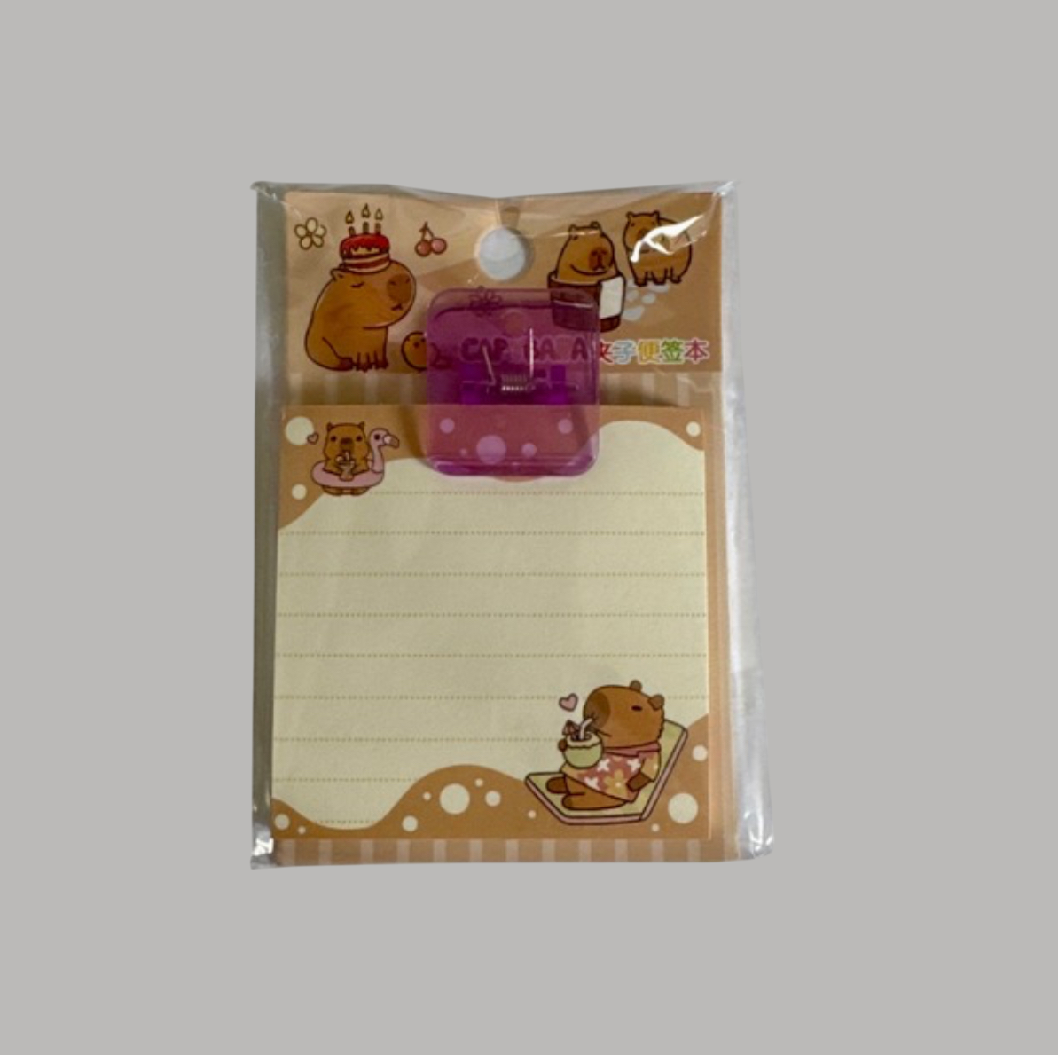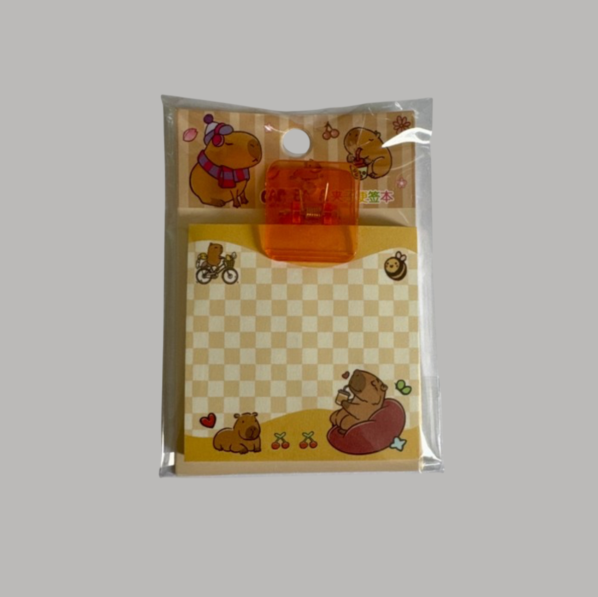 Bloco de notas no tema capivara com folhas decoradas e prendedor em cristal.